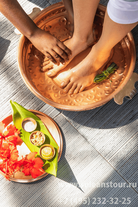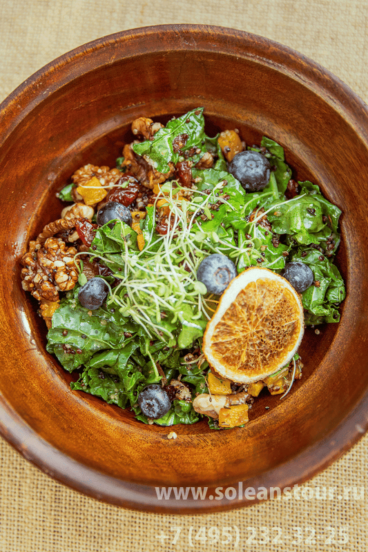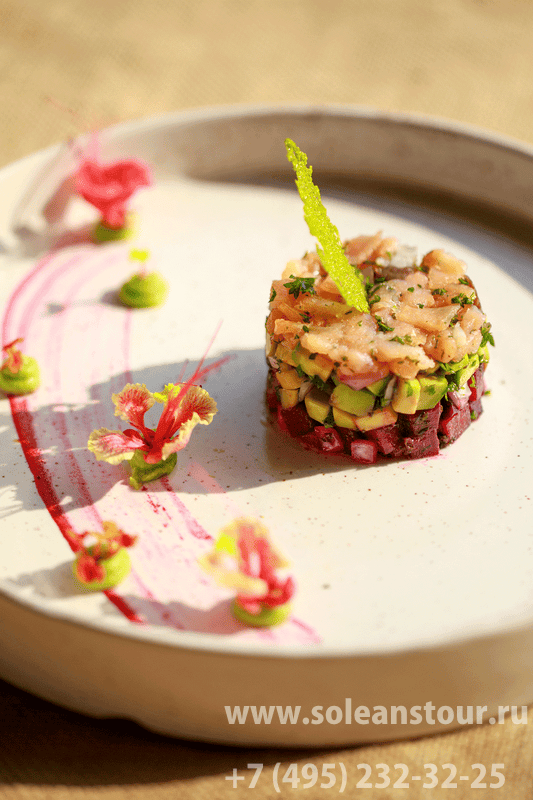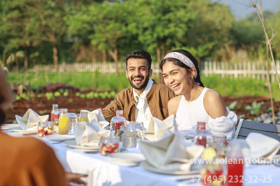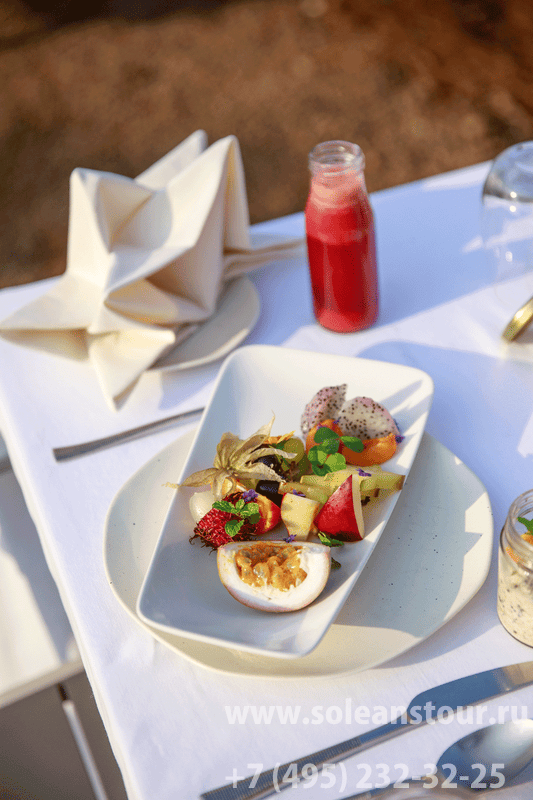 Философия питания, которая практикуется на курорте, заимствована из древних традиций аюрведы. Меню основано на свежих сезонных продуктах и самых полезных ингредиентах, большинство из которых выращено на органической ферме курорта, а принципы медленного приготовления пищи сохраняют ее естественный вкус.