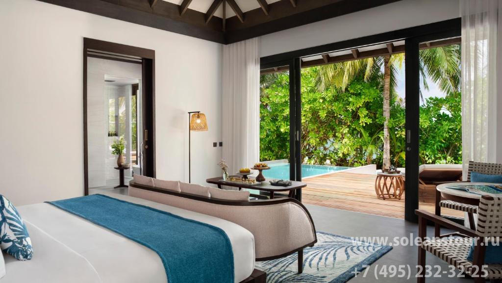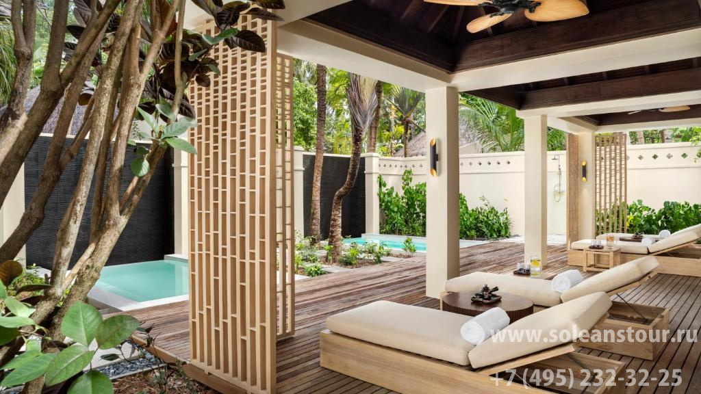 Beach pool villa (148 кв. м): терраса с открытым персональным бассейном, спальня с гостиной зоной (кровать king-size), гардеробная зона, ванная комната с ванной и душем на открытом воздухе. Прямой выход к пляжу. Вид на океан.