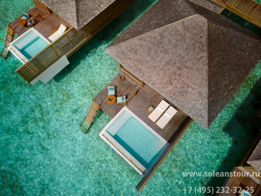 Overwater pool villa (ex. Deluxe overwater pool villa) (125 кв. м): двухуровневая терраса с открытым персональным бассейном, спальня с гостиной зоной (кровать king-size), ванная комната с ванной и душевой кабиной. Расположены на сваях над водой.