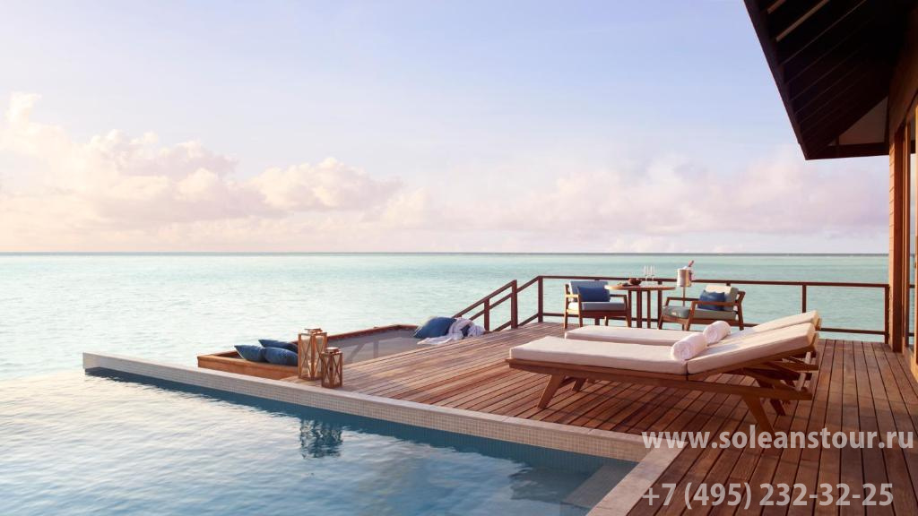 Deluxe overwater pool villa (131 кв. м): двухуровневая терраса с открытым персональным бассейном, спальня с гостиной зоной (кровать king-size), ванная комната с ванной. Расположены на сваях над водой.