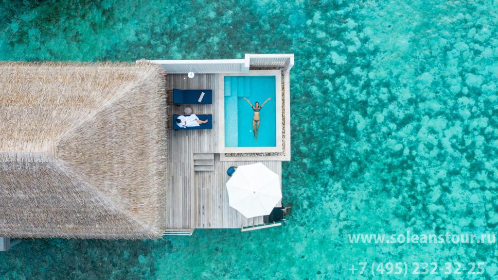 Water villa with pool (ex. Pool water villa) (60 кв. м): терраса (45 кв. м) с небольшим открытым персональным бассейном, спальня с кроватью king-size, ванная комната с ванной и душевой кабиной с функцией «тропический дождь». Расположены на сваях над водой. Вид на океан.