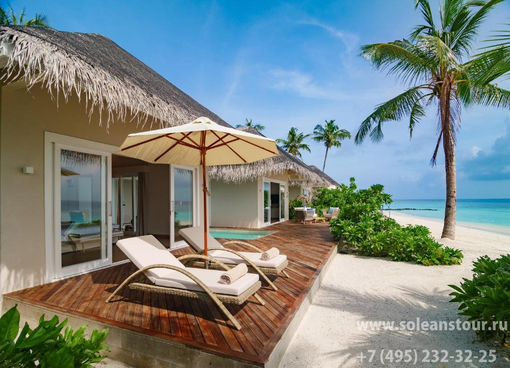 Beach villa (65 кв. м): частный пляж (30 кв. м), терраса (22 кв. м), спальня с кроватью king-size, ванная комната с ванной и душевой кабиной с функцией «тропический дождь». Расположены на пляже. Вид на океан.