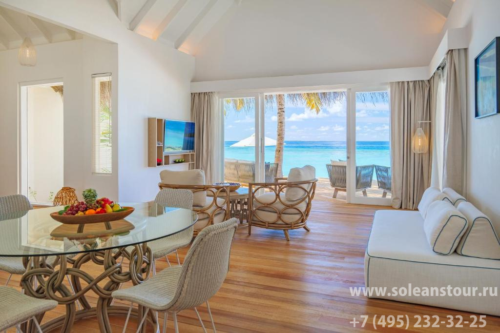 Beach suite with pool 2-bedroom (ex. Pool suite beach villa 2-bedroom) (180 кв. м + террасы 82 кв. м): частный пляж (55 кв. м), терраса с открытым персональным бассейном, гостиная с обеденной зоной, 2 спальни (каждая – с кроватью king-size), 2 ванные комнаты (каждая – с ванной и душевой кабиной с функцией «тропический дождь»), гостевой туалет. Вид на океан.