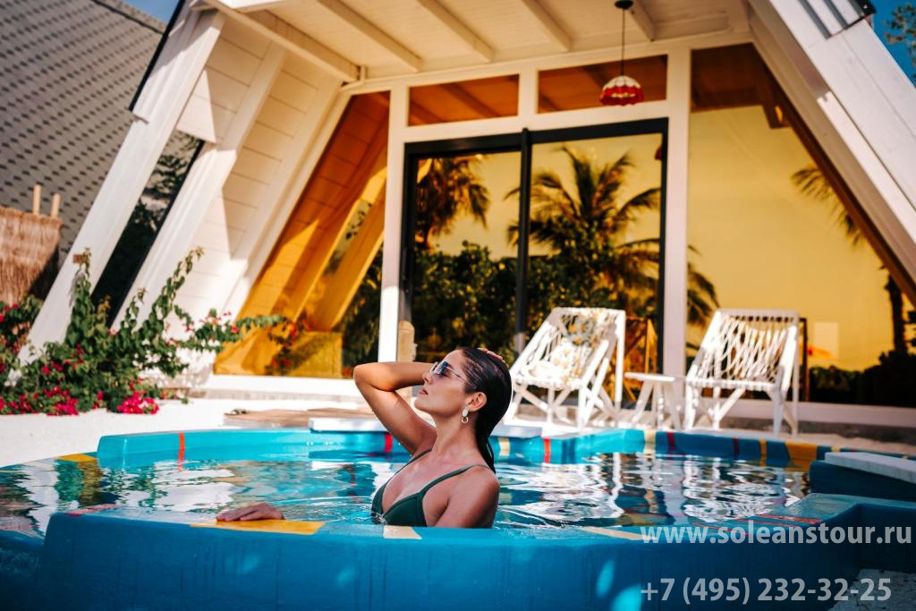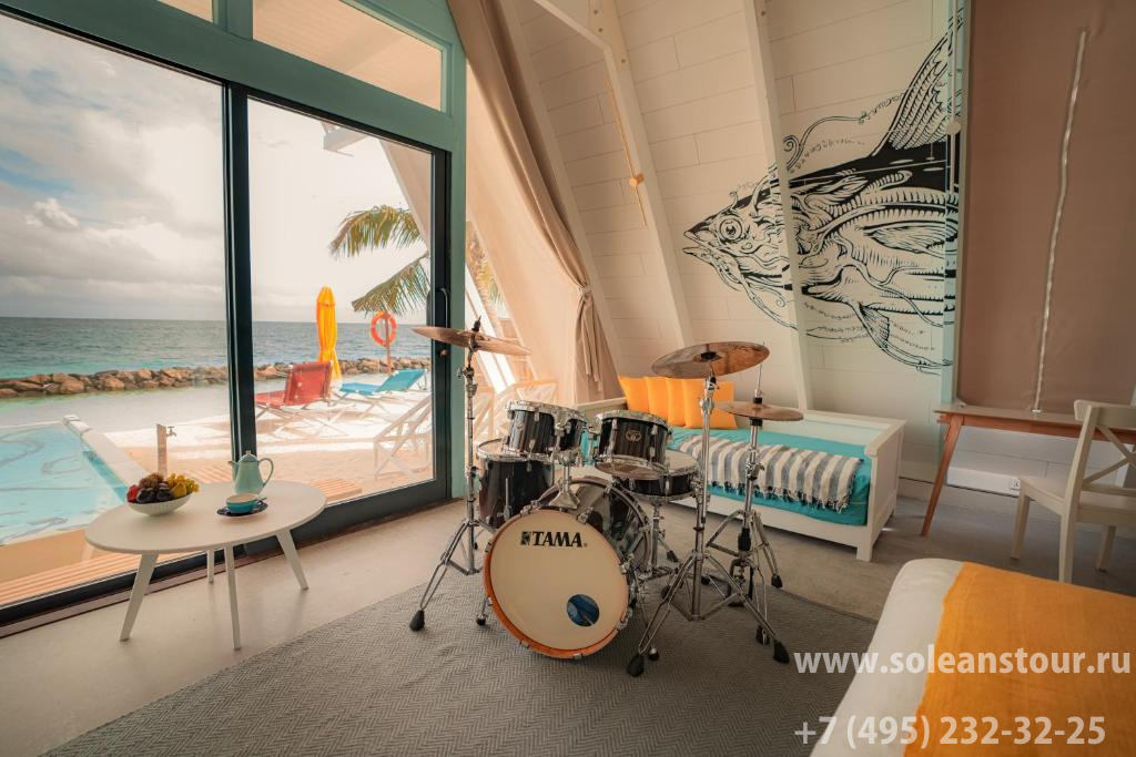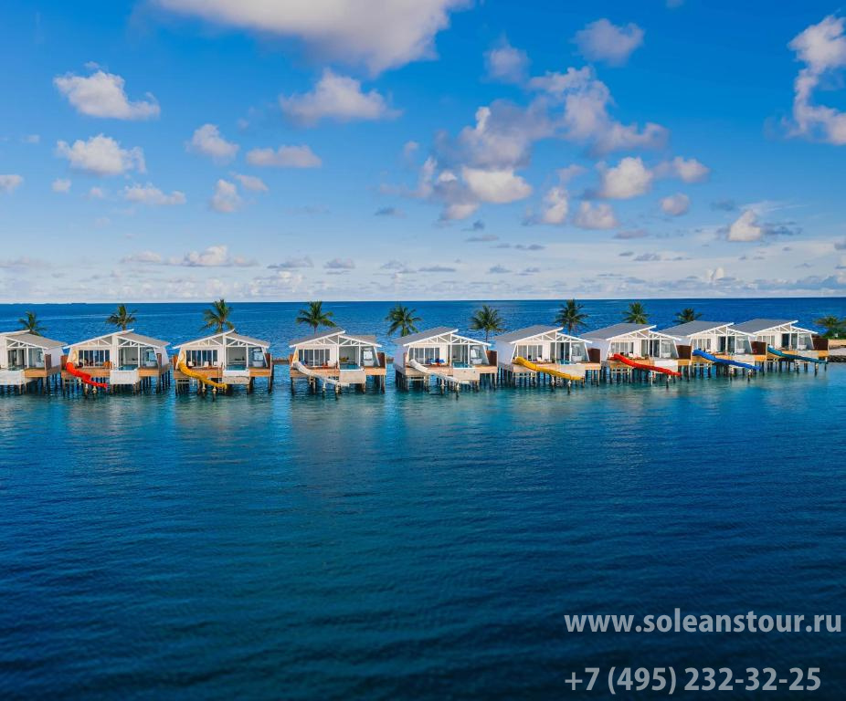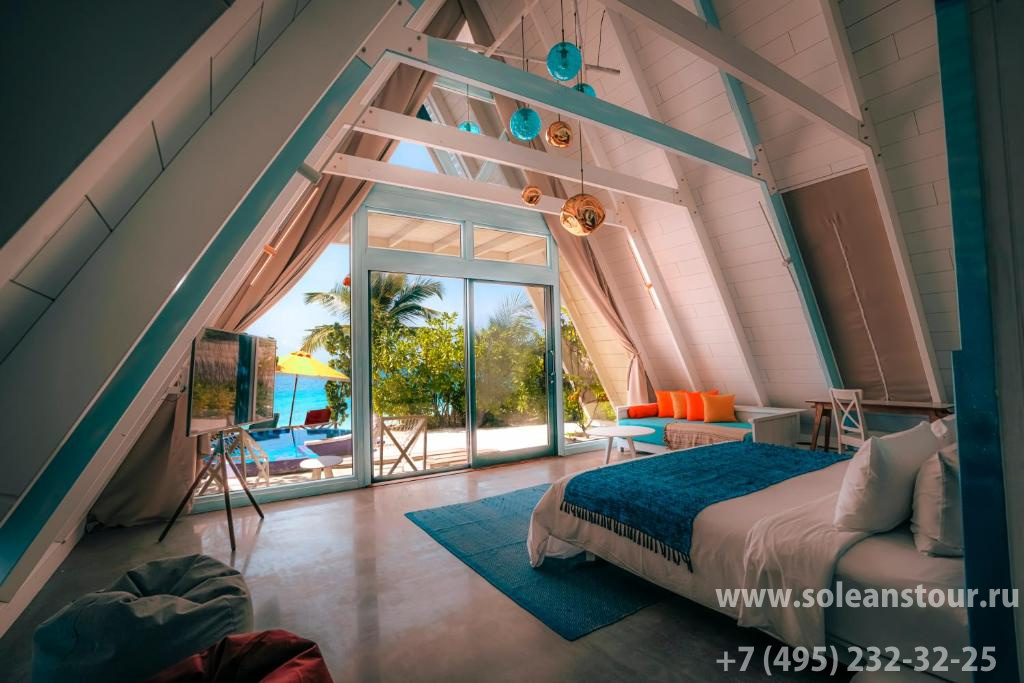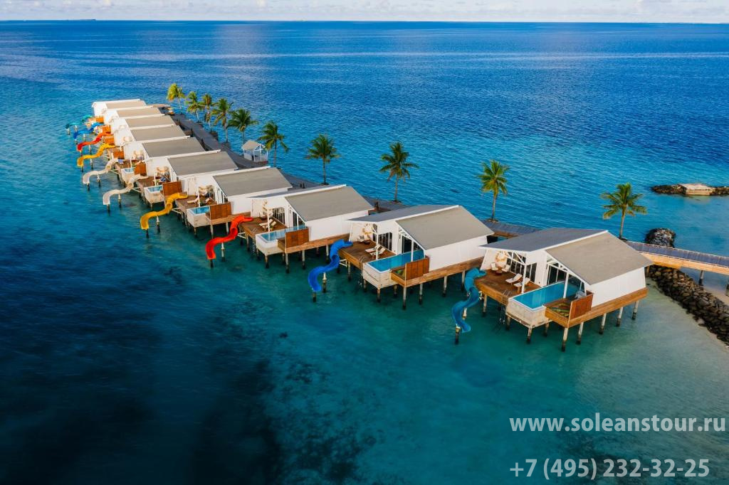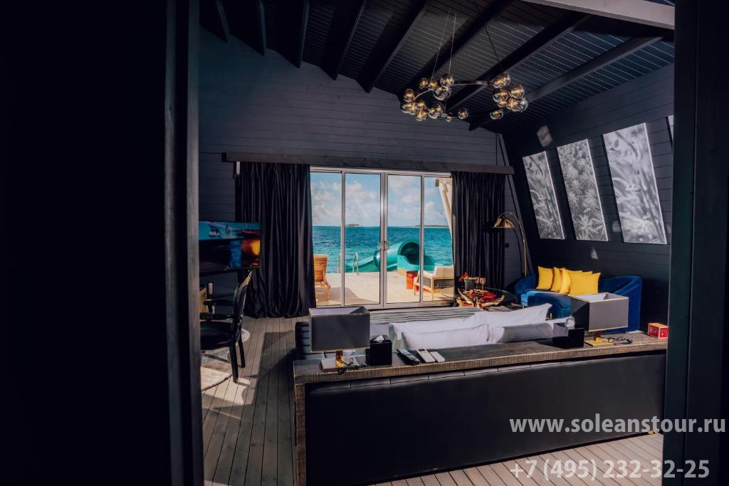 Водные виллы, площадь — 165 кв. м, вид на океан и восход. В номере: спальня (1 двуспальная кровать), ванная комната частично на открытом воздухе, терраса с шезлонгами, личный бассейн, гамак над водой, прямой спуск в океан. Макс. число гостей — 3 чел.