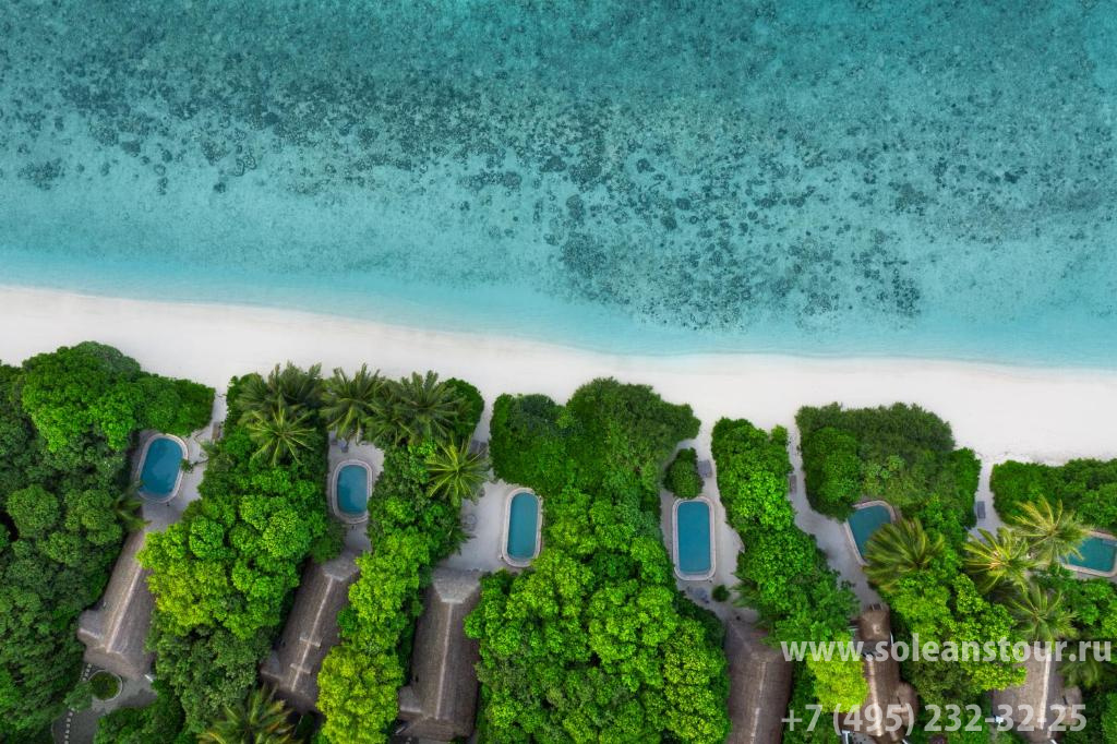 Sunrise retreat 3-bedroom (Villa 2) (3-bedroom beach retreat) (ex. Sunrise retreat 3-bedroom with pool (Villa 2) (3-bedroom villa suite with pool)) (884 кв. м): состоит из трех двухэтажных вилл, террасы с открытым персональным бассейном, обеденного павильона на открытом воздухе и павильона для занятий фитнесом. На первой вилле: балкон, спальня с кроватью king-size, гардеробная, ванная комната на открытом воздухе с ванной и душем. На второй вилле: гостиная, кабинет, кухня, спальня, ванная комната на открытом воздухе. На третьей вилле: балкон, кабинет/игровая зона, спальня, ванная комната. Дополнительно: винный холодильник. Прямой выход на пляж.