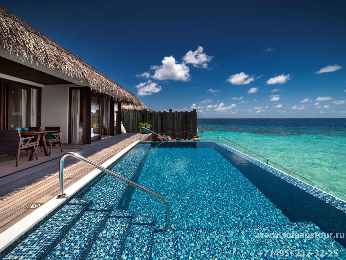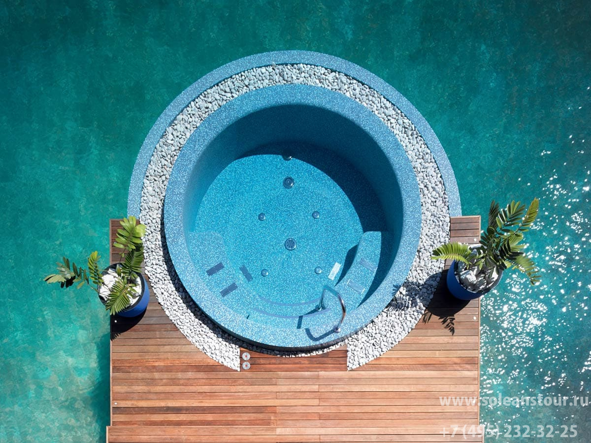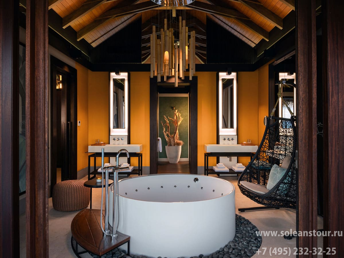 Ocean pool house 2-bedroom (223 кв. м; общая площадь - 493 кв. м): терраса с открытым персональным бассейном (45 кв. м) и ванной на открытом воздухе, обеденная зона на открытом воздухе (стол на 4 персоны), гостиная, кухня, 2 спальни, 2 гардеробные зоны, 2 ванные комнаты (каждая – с ванной и душевой кабиной), гостевой туалет. Расположен на сваях над водой.