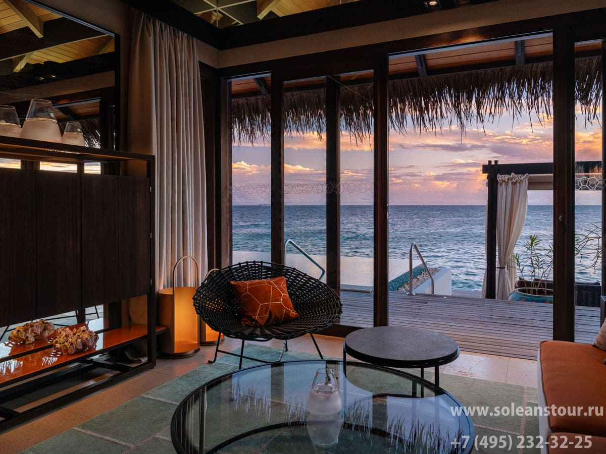 Sunset deluxe water pool villa (102 кв. м; общая площадь - 245 кв. м): терраса с открытым персональным бассейном (40 кв. м), обеденная зона на открытом воздухе (стол на 4 персоны), гостиная, спальня, ванная комната с ванной и душевой кабиной. Расположены на сваях над водой. Вид на океан и закат.