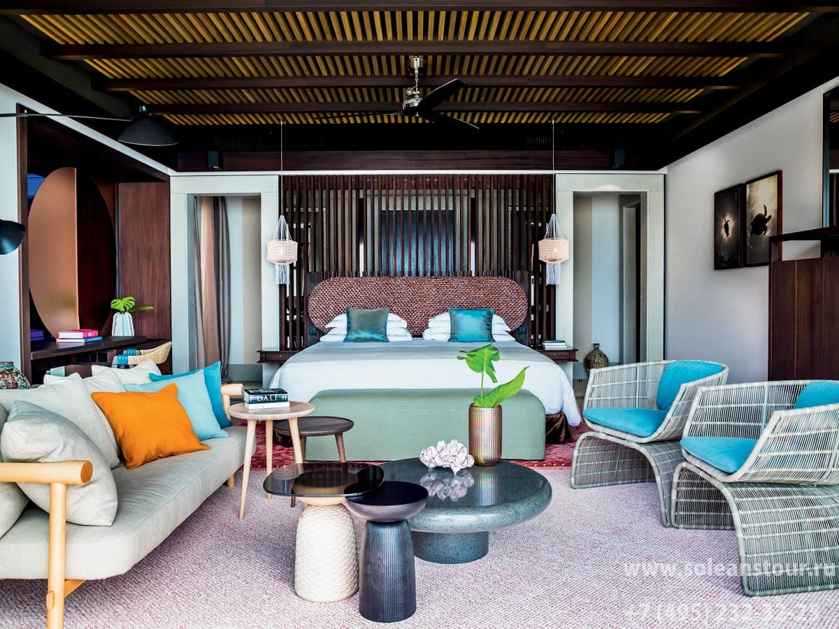 Deluxe beach pool villa (108 кв. м; общая площадь - 313 кв. м): терраса с открытым персональным бассейном (50 кв. м), обеденный павильон на открытом воздухе (стол на 4 персоны), гостиная, спальня, гардеробная зона, ванная комната с ванной на открытом воздухе и душевой кабиной.