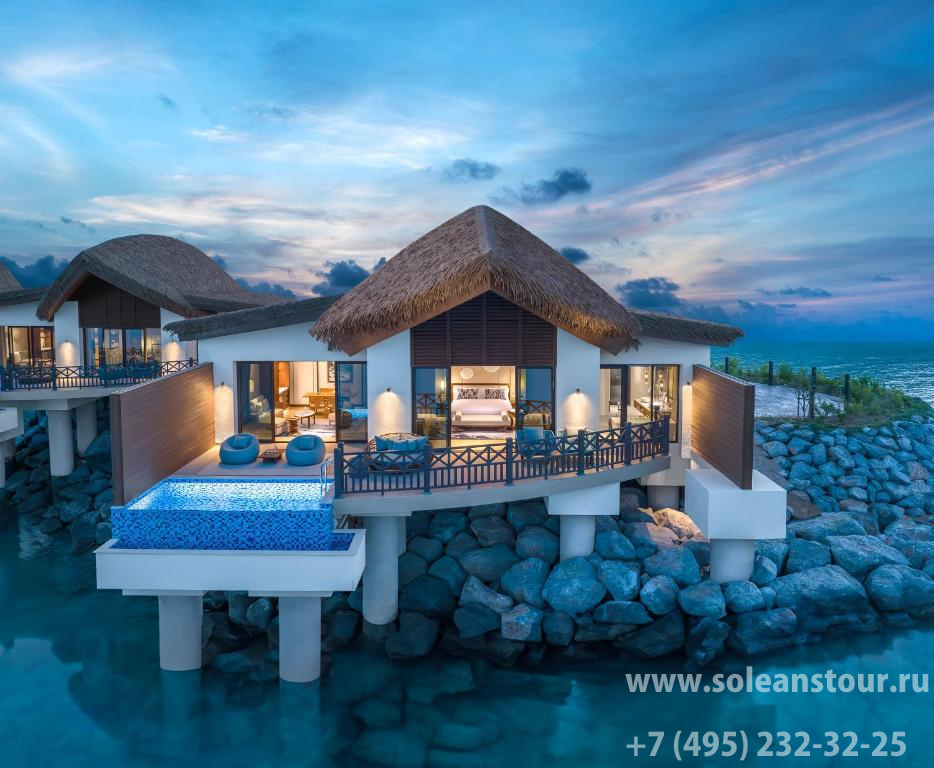 Over water pool villa (82 кв. м): терраса с открытым персональным бассейном и обеденной зоной на открытом воздухе, гостиная, спальня с кроватью king-size, гардеробная, ванная комната с ванной и душевой кабиной. Расположены на сваях над водой. Вид на море.