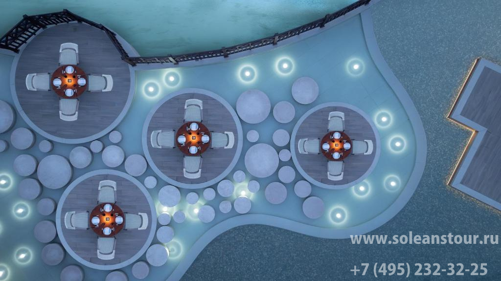 Two bedroom royal over water pool villa (365 кв. м): терраса с открытым персональным бассейном и обеденной зоной на открытом воздухе, гостиная с обеденной зоной, кабинет, комната для прислуги, 2 спальни (одна – с кроватью king-size, другая – с двумя отдельными кроватями), ванная комната, душ на открытом воздухе. Расположены на сваях над водой. Вид на море.