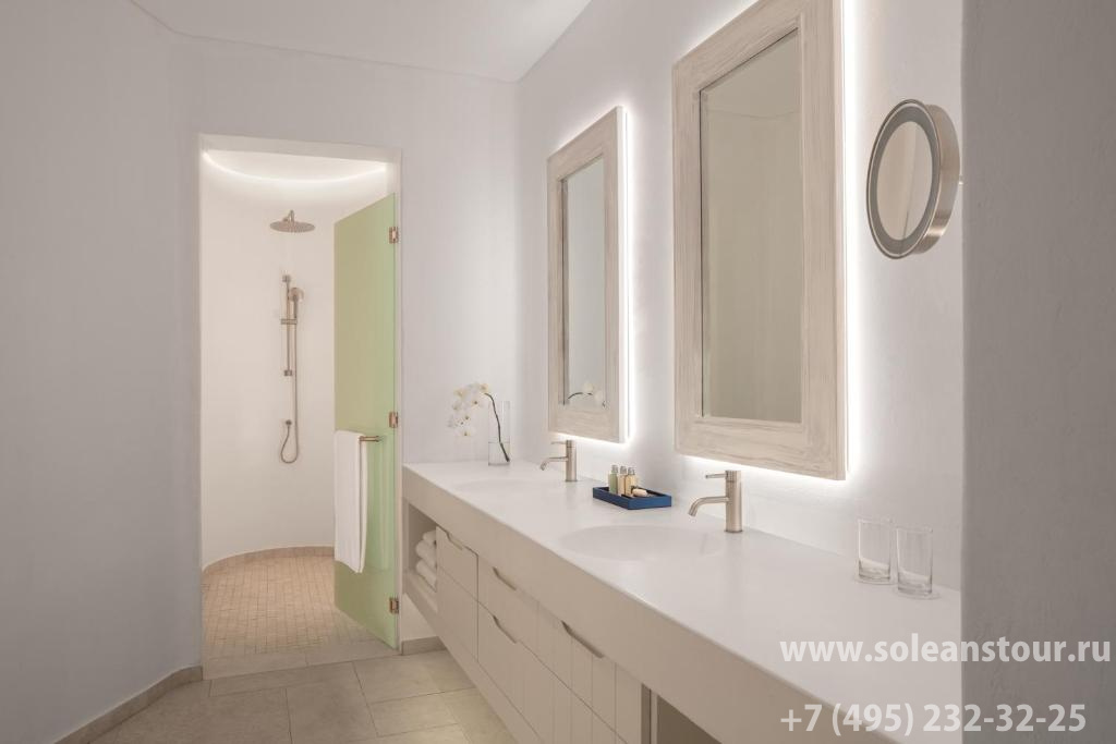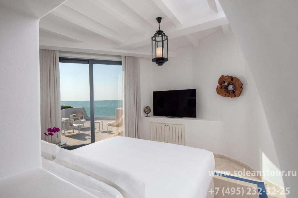 Royal santorini duplex suite (255 кв. м): двухэтажный номер. 2 террасы, гостиная, спальня с кроватью king-size, гардеробная, ванная комната. Дополнительно: тренажерный зал. Имеют прямой доступ к общему бассейну. Панорамный вид на море.