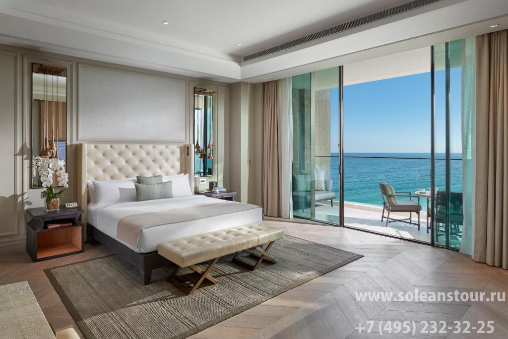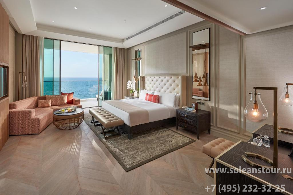 Premier sea view room (58 кв. м): балкон, спальня с гостиной зоной (кровать king-size или две отдельные кровати), гардеробная, ванная комната с ванной и душевой кабиной. Прямой вид на Персидский залив.
