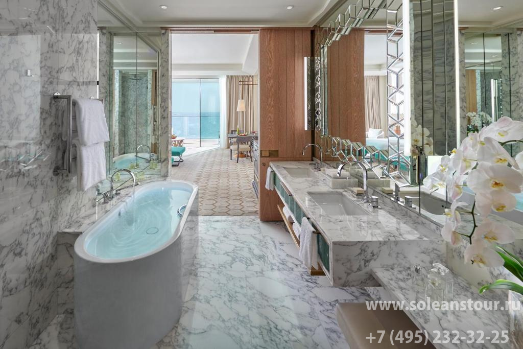 Presidential suite (350 кв. м): двухуровневый номер. Терраса с открытым персональным бассейном на крыше, балконы, гостиные, обеденная зона (стол на 10 персон), 3 спальни (две – с кроватью king-size, третья – с двумя отдельными кроватями), 3 ванные комнаты (две – с ванной, душевой кабиной и парными), гостевой туалет. Расположен на верхнем этаже. Вид на Персидский залив. Гости данного номера имеют особые привилегии.
