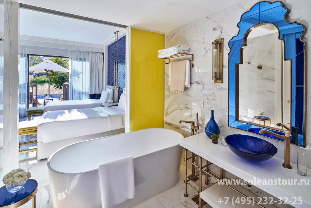 2-bedroom family room pool access (90 кв. м): терраса, 2 спальни (1 - с кроватью king-size, 1 - с двумя отдельными кроватями),2 ванные комнаты. Расположены на первом этаже. Прямой доступ к бассейну.