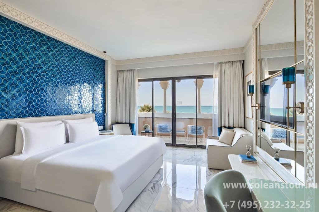 Deluxe room sea view (45 кв. м): балкон (в некоторых номерах), спальня с кроватью king-size, ванная комната. Вид на море.