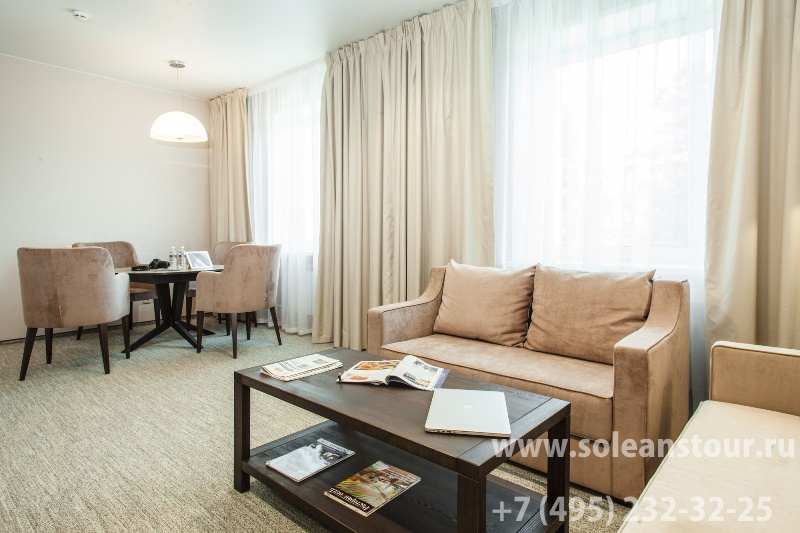 Люкс (48 кв. м) подойдет тому, кто ценит свободное пространство и основательность стиля. Номеру свойствен сдержанный шик, здесь царит деловая и одновременно спокойная атмосфера.