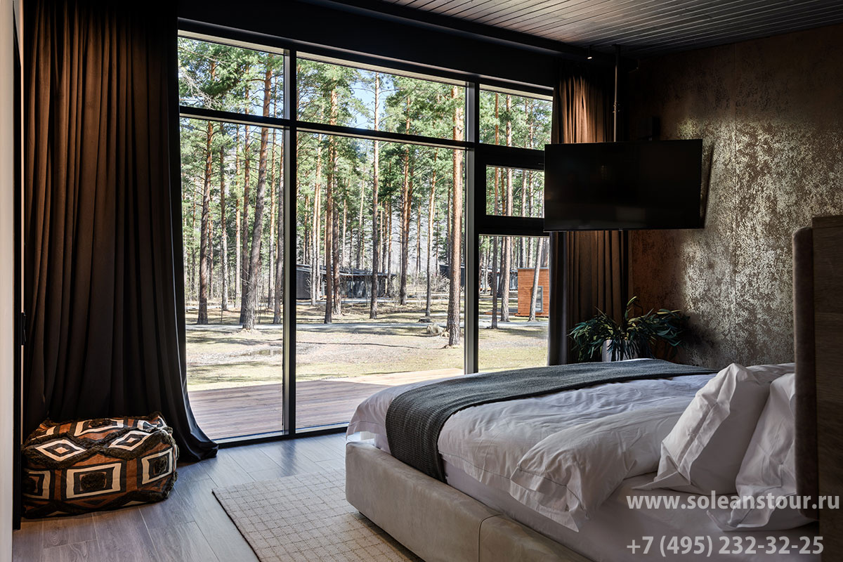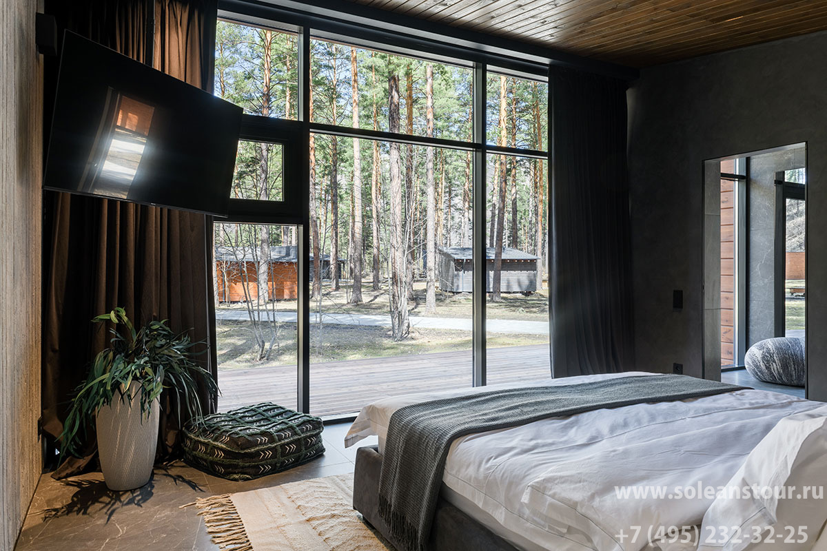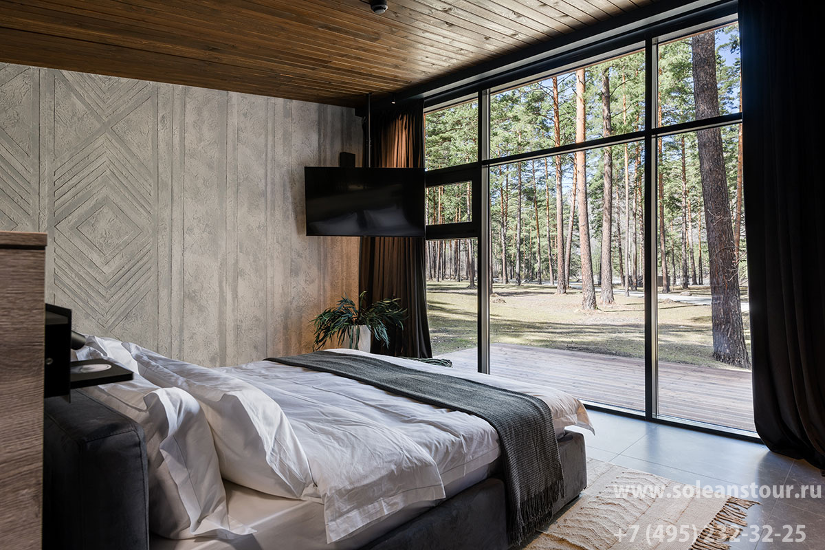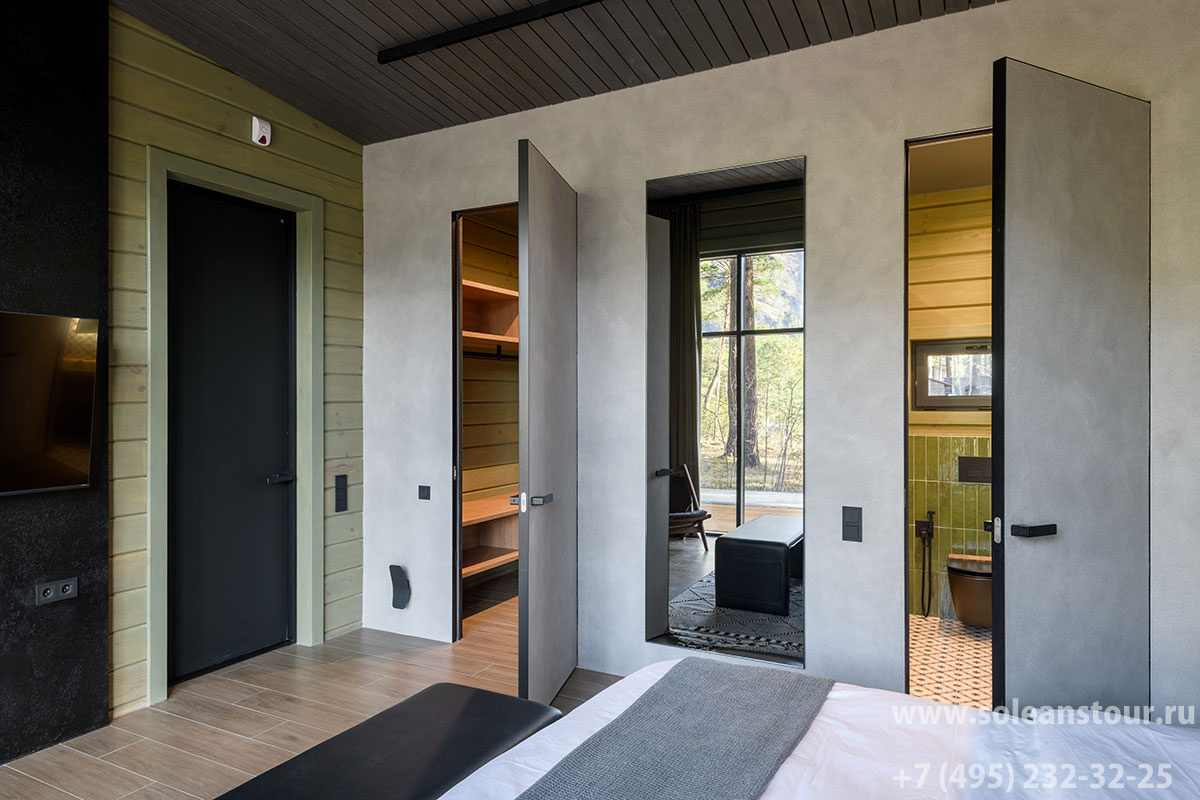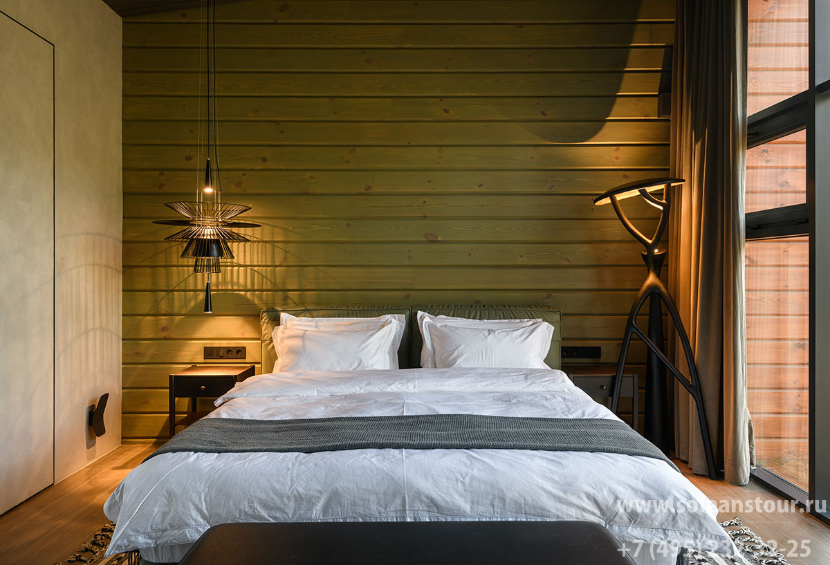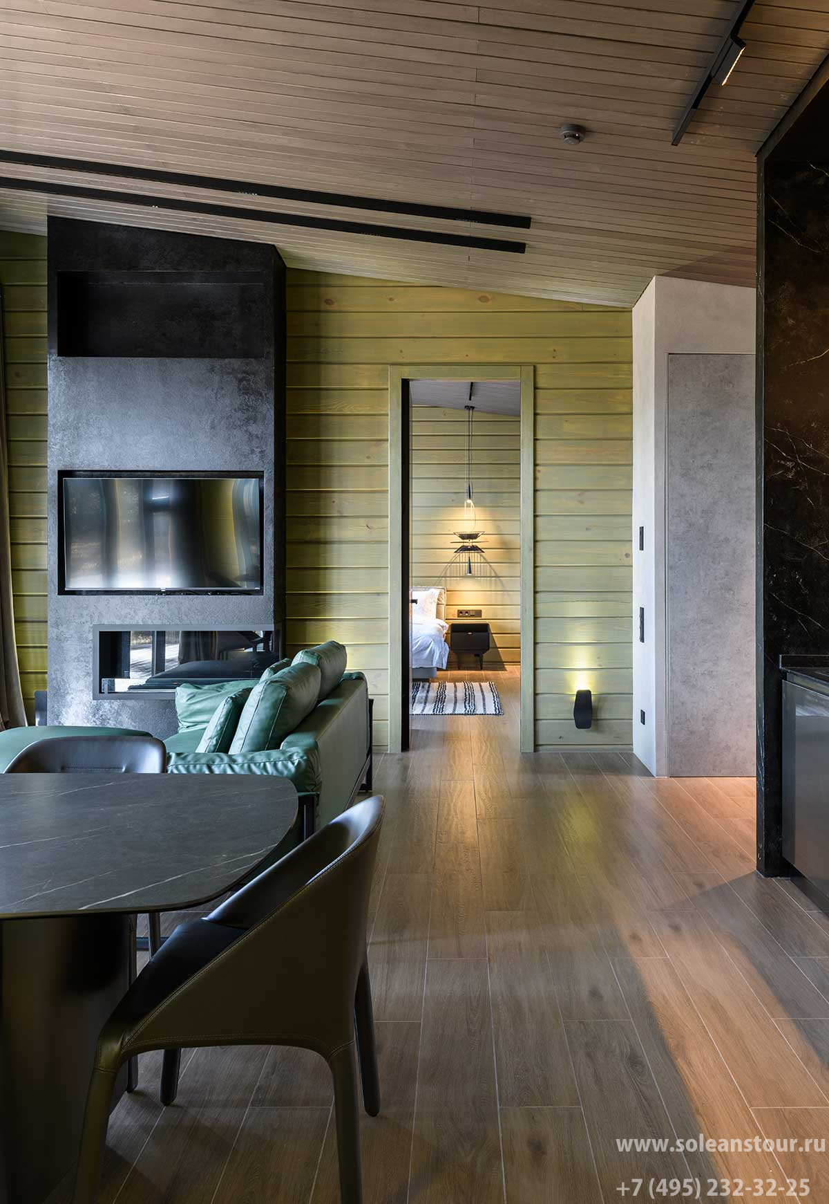 В шале: собственная терраса 21,5м2, кухонная зона и капсульная кофемашина, просторные шкафы для вещей, ванная комната с полным комплектом гигиенических приборов, сейф, халаты, тапочки, мини-холодильник, гладилка и утюг.