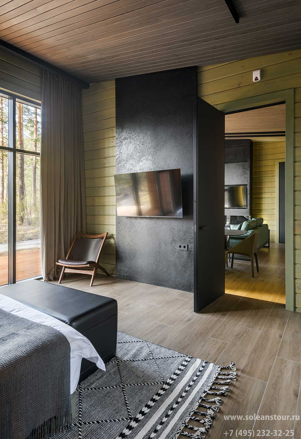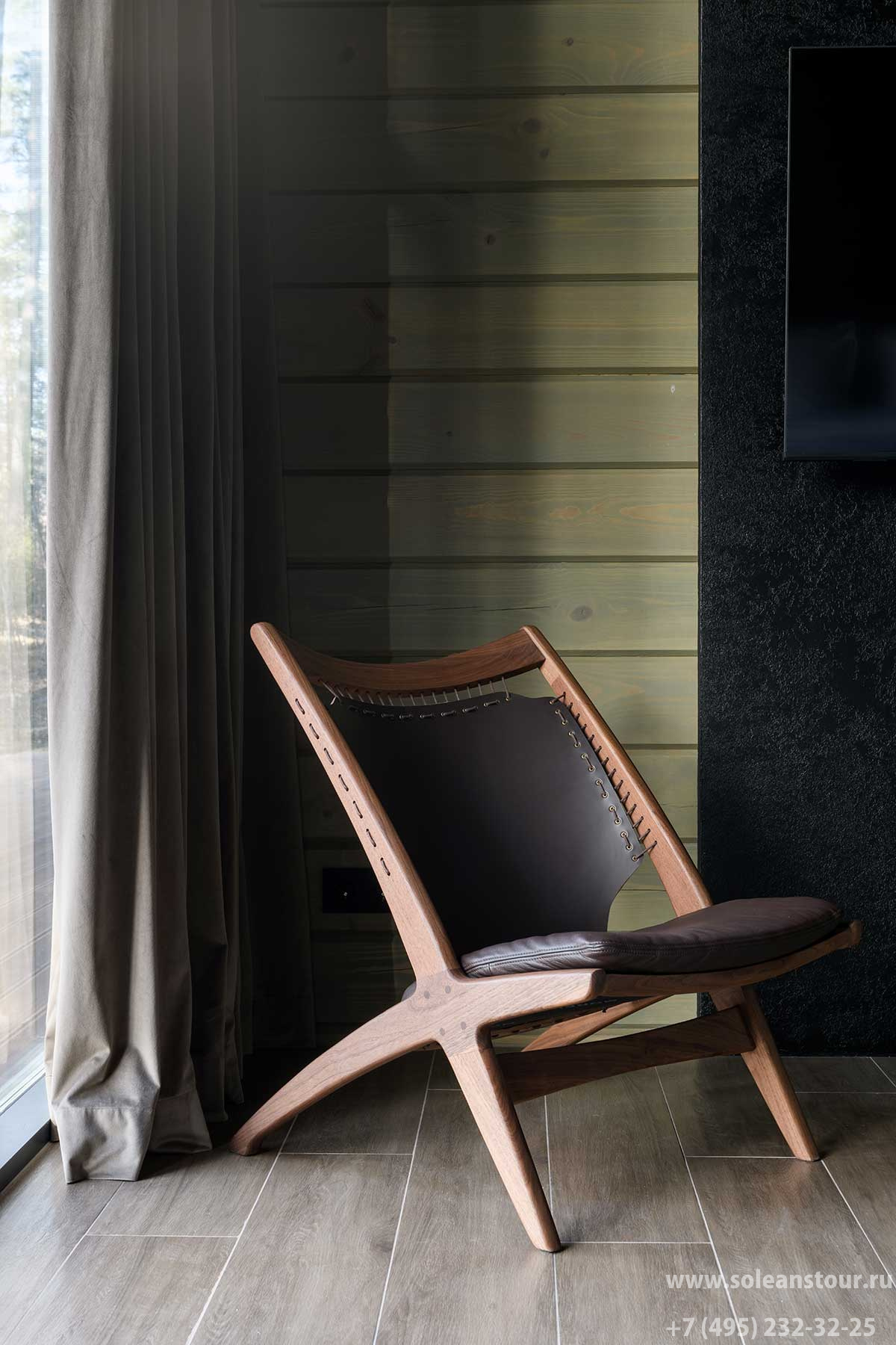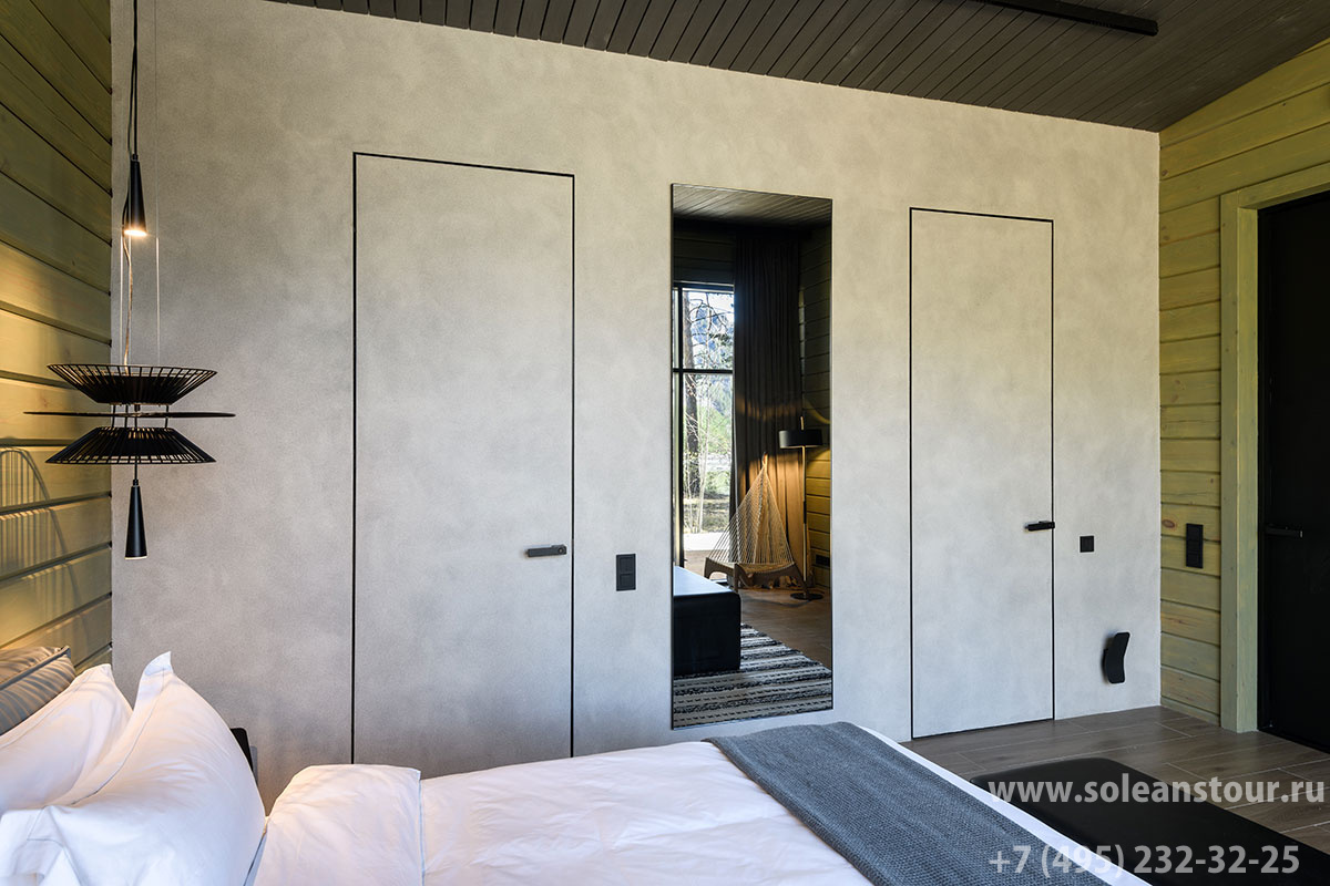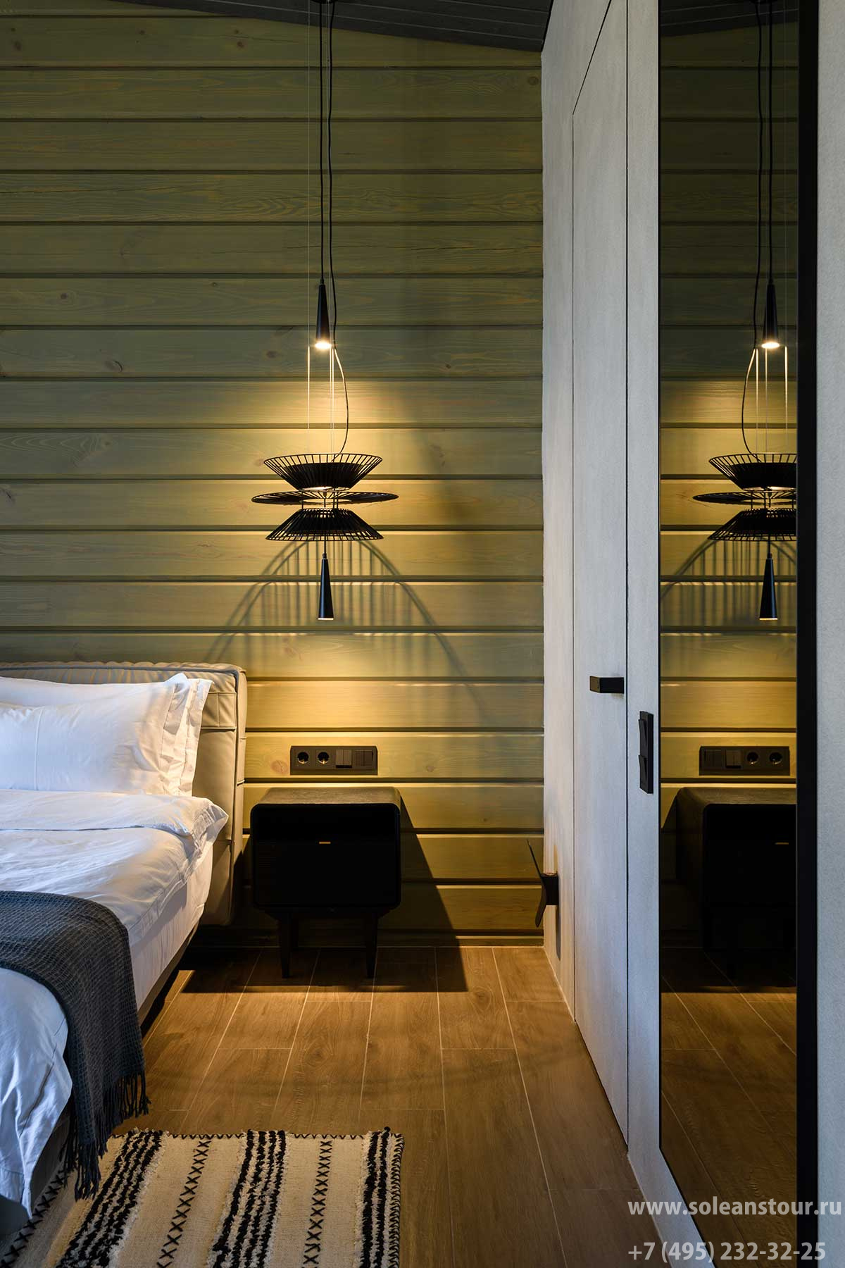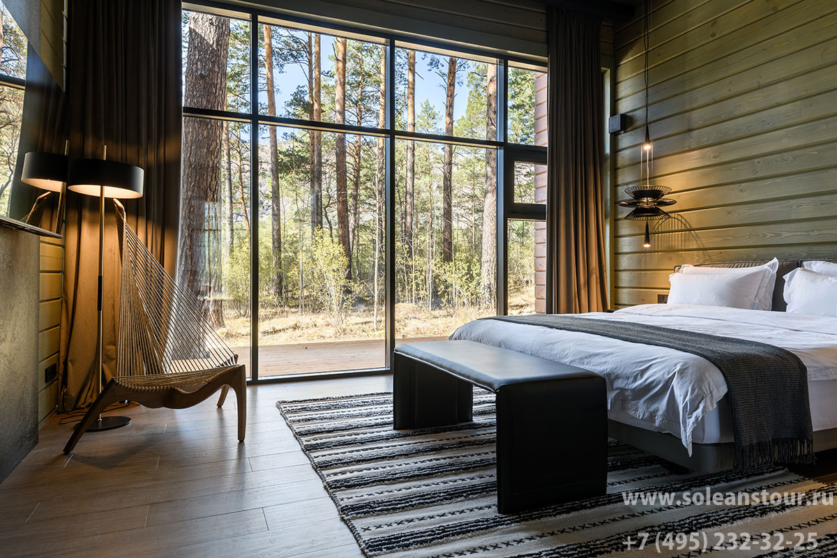 В шале: собственная терраса 21,5м2, кухонная зона и капсульная кофемашина, просторные шкафы для вещей, ванная комната с полным комплектом гигиенических приборов, сейф, халаты, тапочки, мини-холодильник, гладилка и утюг.