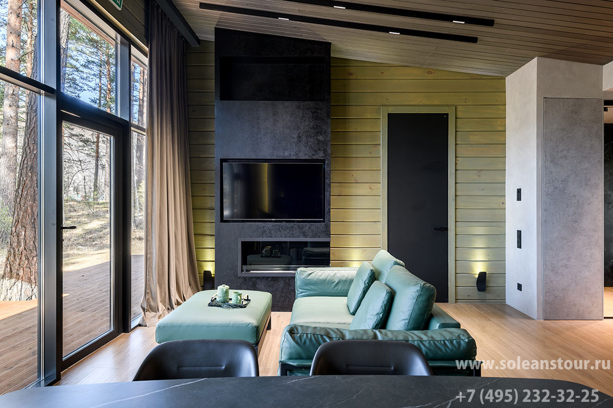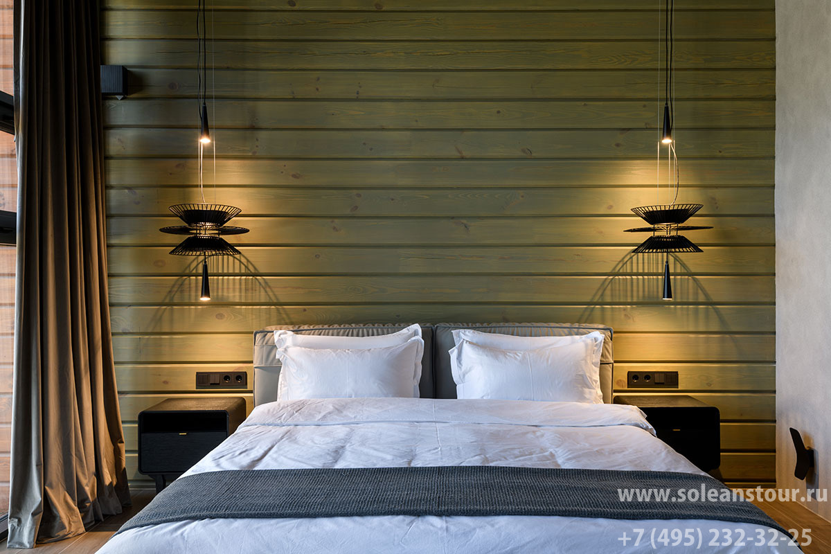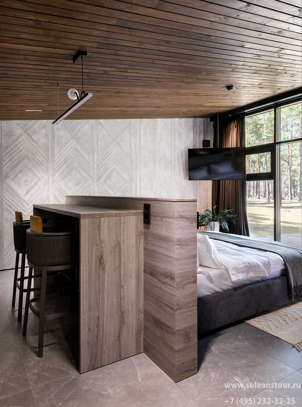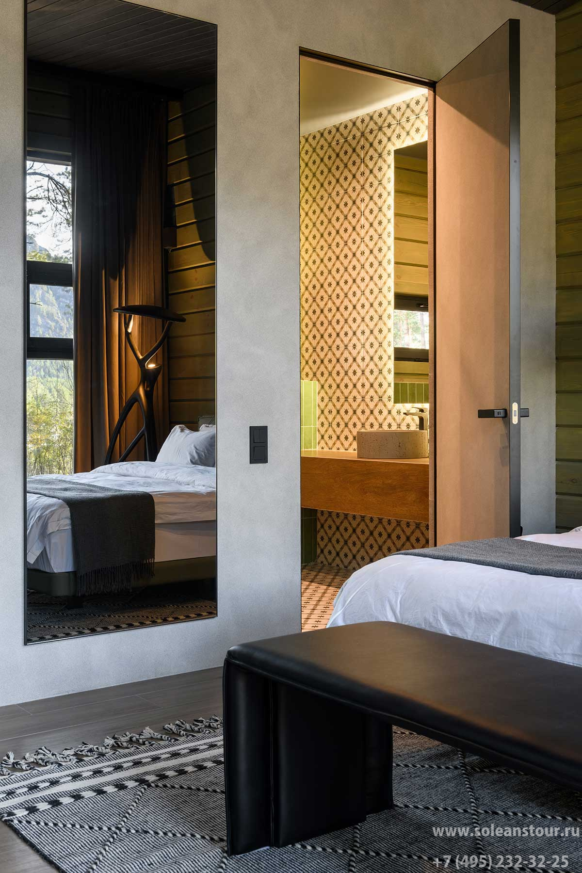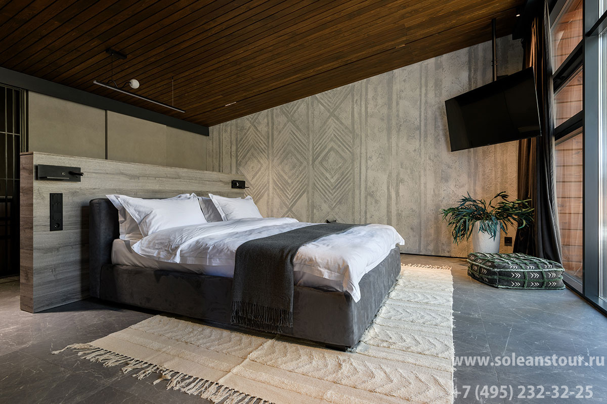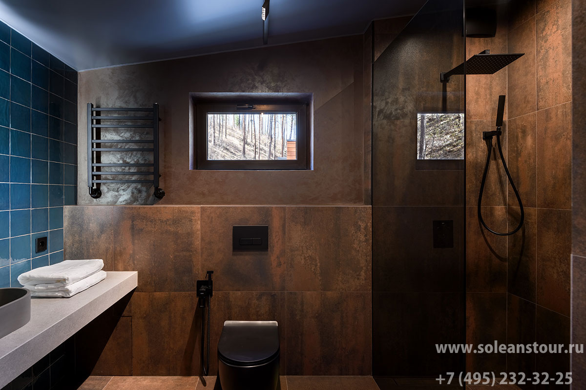 В шале: собственная терраса 21,5м2, кухонная зона и капсульная кофемашина, просторные шкафы для вещей, ванная комната с полным комплектом гигиенических приборов, сейф, халаты, тапочки, мини-холодильник, гладилка и утюг.