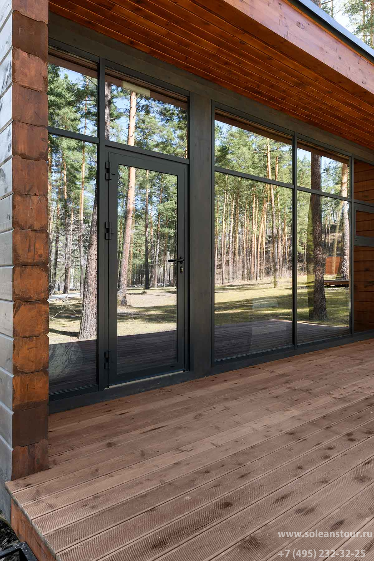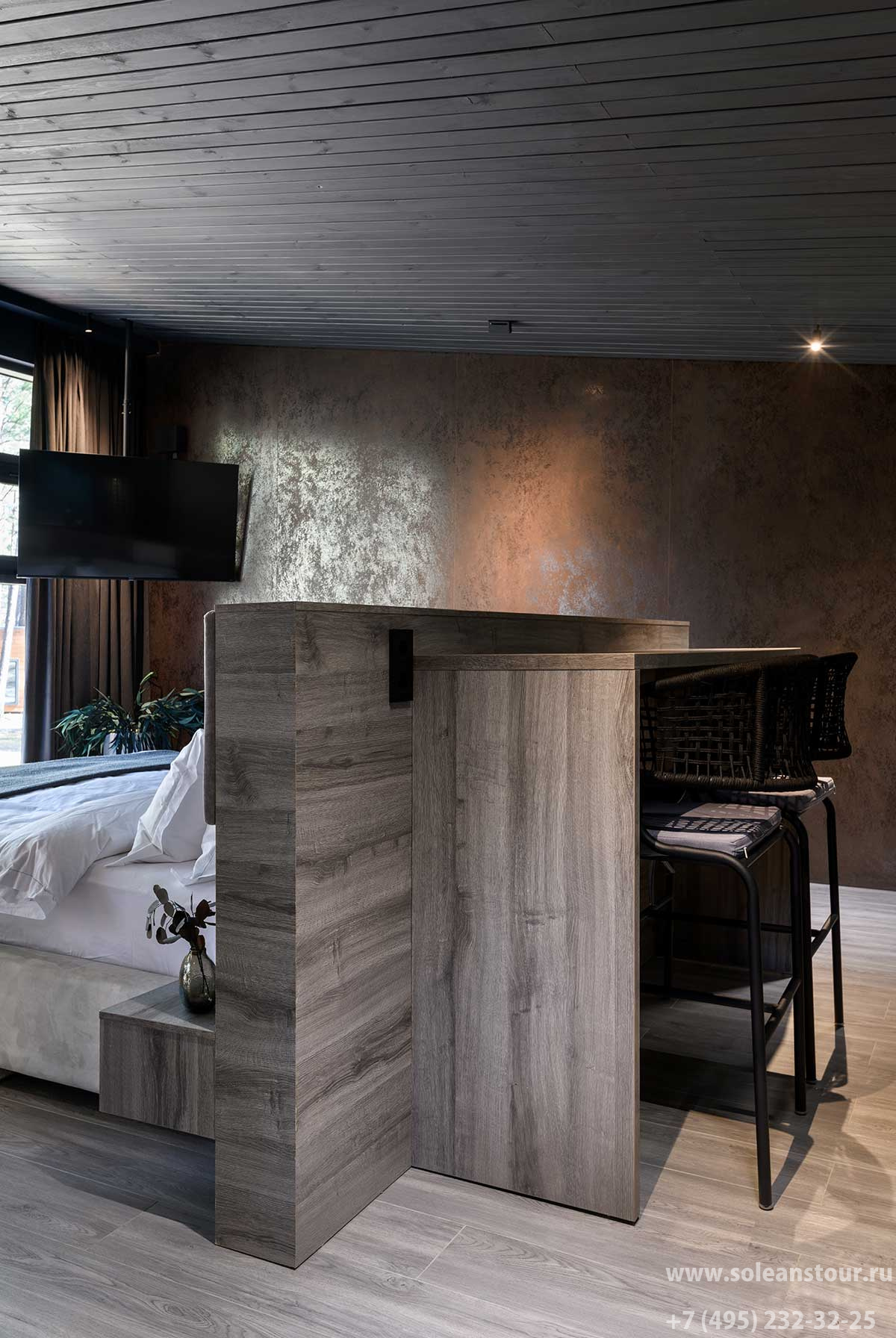 В шале премиум: собственная терраса 47,5м2, кухонная зона с обеденной зоной, капсульная кофемашина, гладилка и утюг.