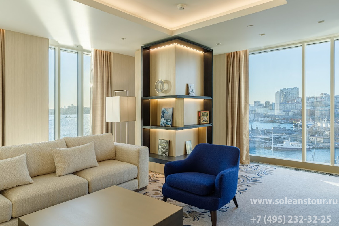 - Категория «Делюкс» — номера площадью 80 кв. м с панорамными окнами, которые позволяют любоваться бухтой Золотой Рог. Гости могут бесплатно пользоваться Представительской гостиной.