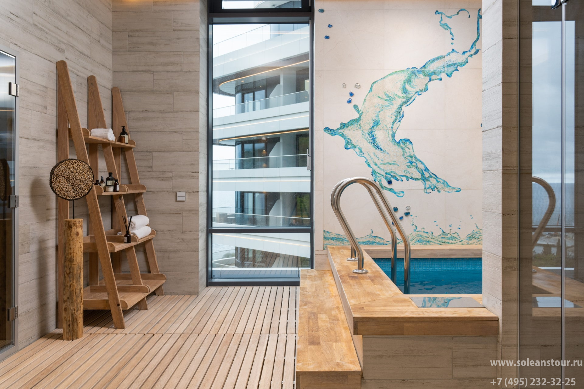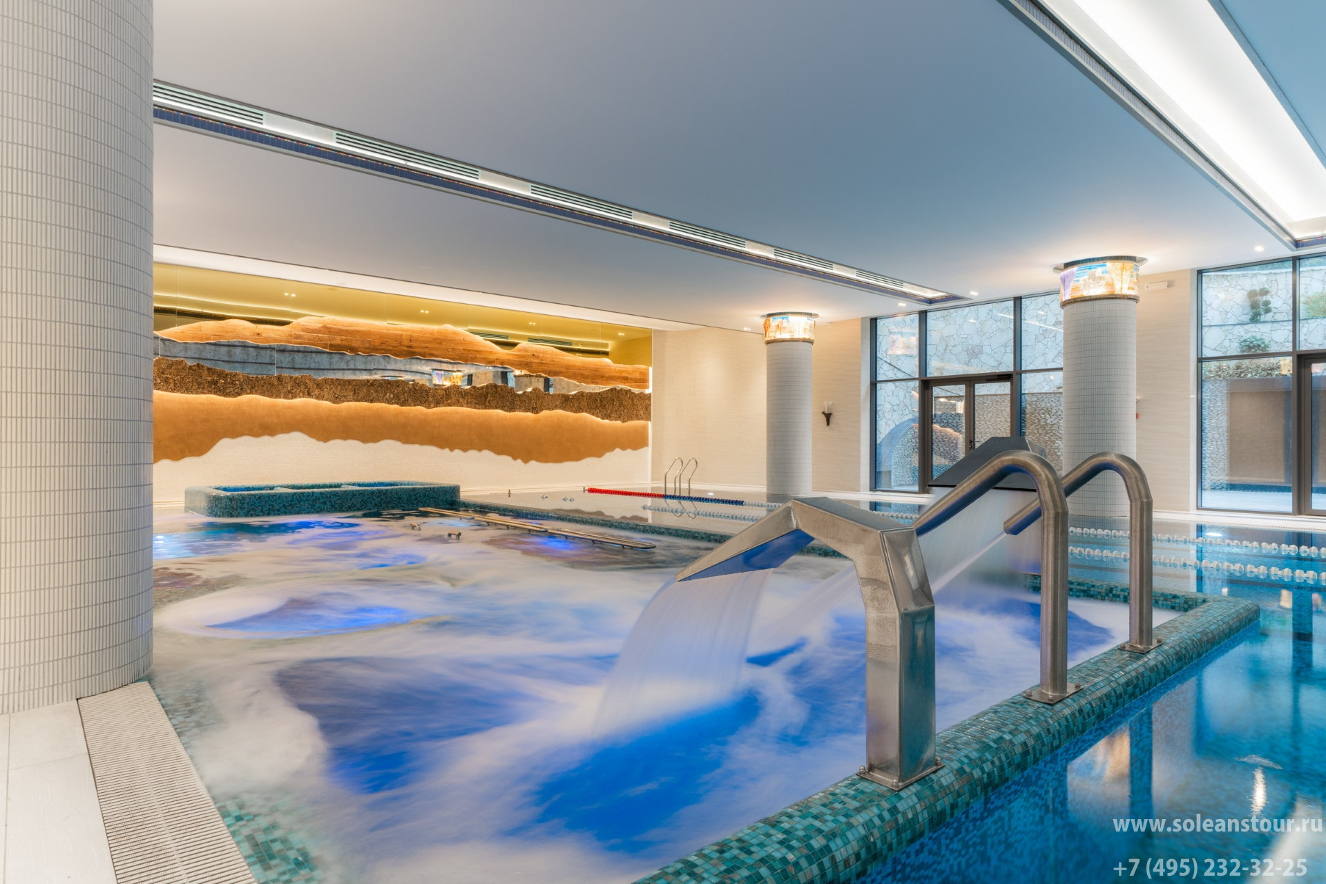 На территории так же SPA-комплекс с акватермальной зоной, крытый и открытый бассейны, фитнес зал с самым продвинутым оборудованием и великолепным видом на горы.