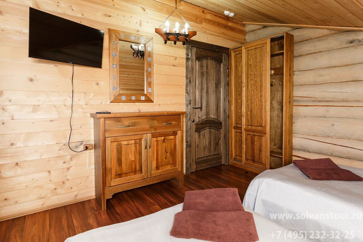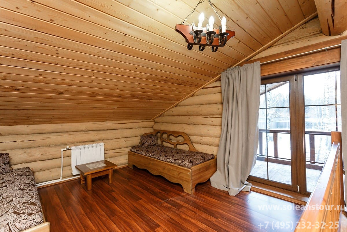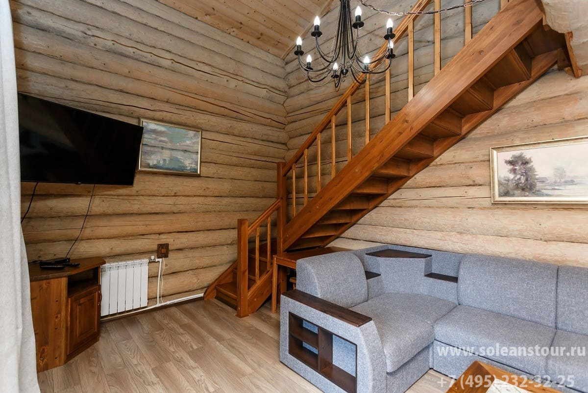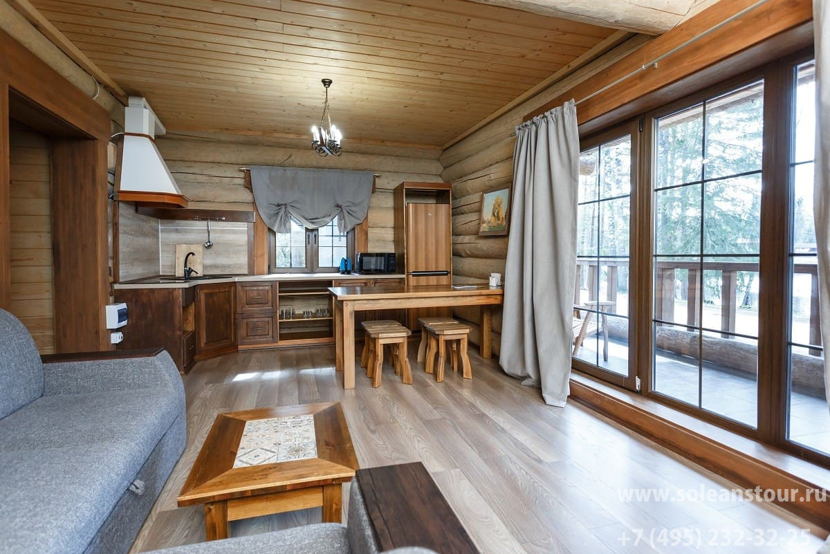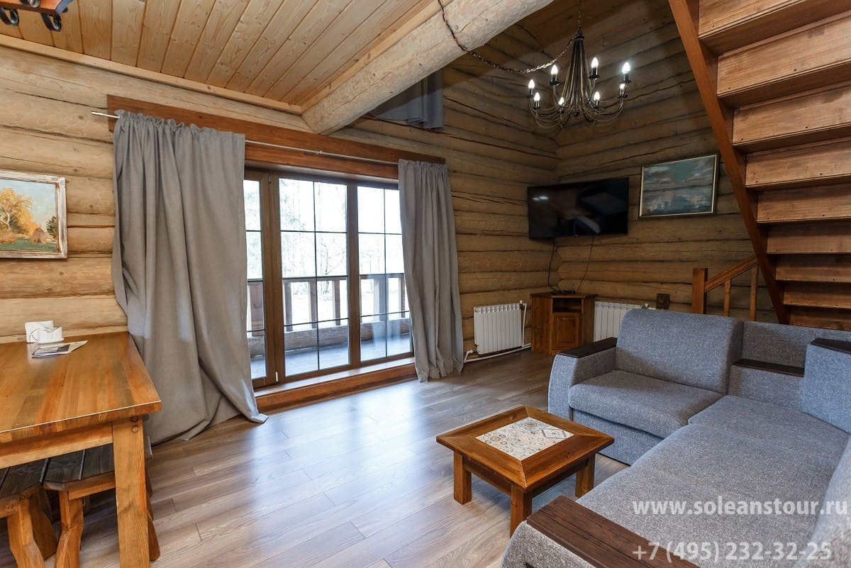 Отдельно стоящий коттедж на 3 спальни — уютный рубленный деревянный дом с авторской мебелью ручной работы, выполненный полностью из экологически чистых материалов. Дом расположен на берегу озера, имеет свою обособленную территорию, скрытую от посторонних глаз. На территории Дачи в 15 соток расположены русская баня, мангальная зона, собственный пирс с весельной лодкой (в теплое время года), места для парковки. В коттедже доступен Wi-Fi и кабельное/цифровое ТВ.